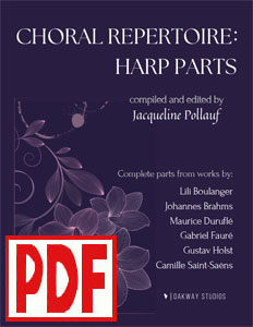 Choral Repertoire: Harp Parts, compiled and edited by Jacqueline Pollauf, is a collection of complete harp parts from seven choral works. The book includes music from six standard choral pieces as well as Pollauf's own transcription of a piece by Lili Boulanger. The parts have not been simplified for ease of playing, but each part is re-notated with modern notation and includes helpful harp-specific information: pedal markings, cues, enharmonic equivalents, and some suggested fingerings. Page layouts have been carefully optimized for page turns. A textual introduction is also provided for each part with background information and performance notes. This collection is an excellent resource for harpists, from students to professionals, in learning, rehearsing, and performing these works.