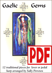 Sally Perreten has arranged twelve traditional Celtic hornpipes, jigs, and airs in a very harpistic and playable style with ornaments and harmonics. Most of these intermediate pieces are in G (1 sharp) or D (2 sharps). She's Like a Swallow is in B-flat (2 flats). There is only one lever change within the music. Chord symbols are included, but no fingerings.